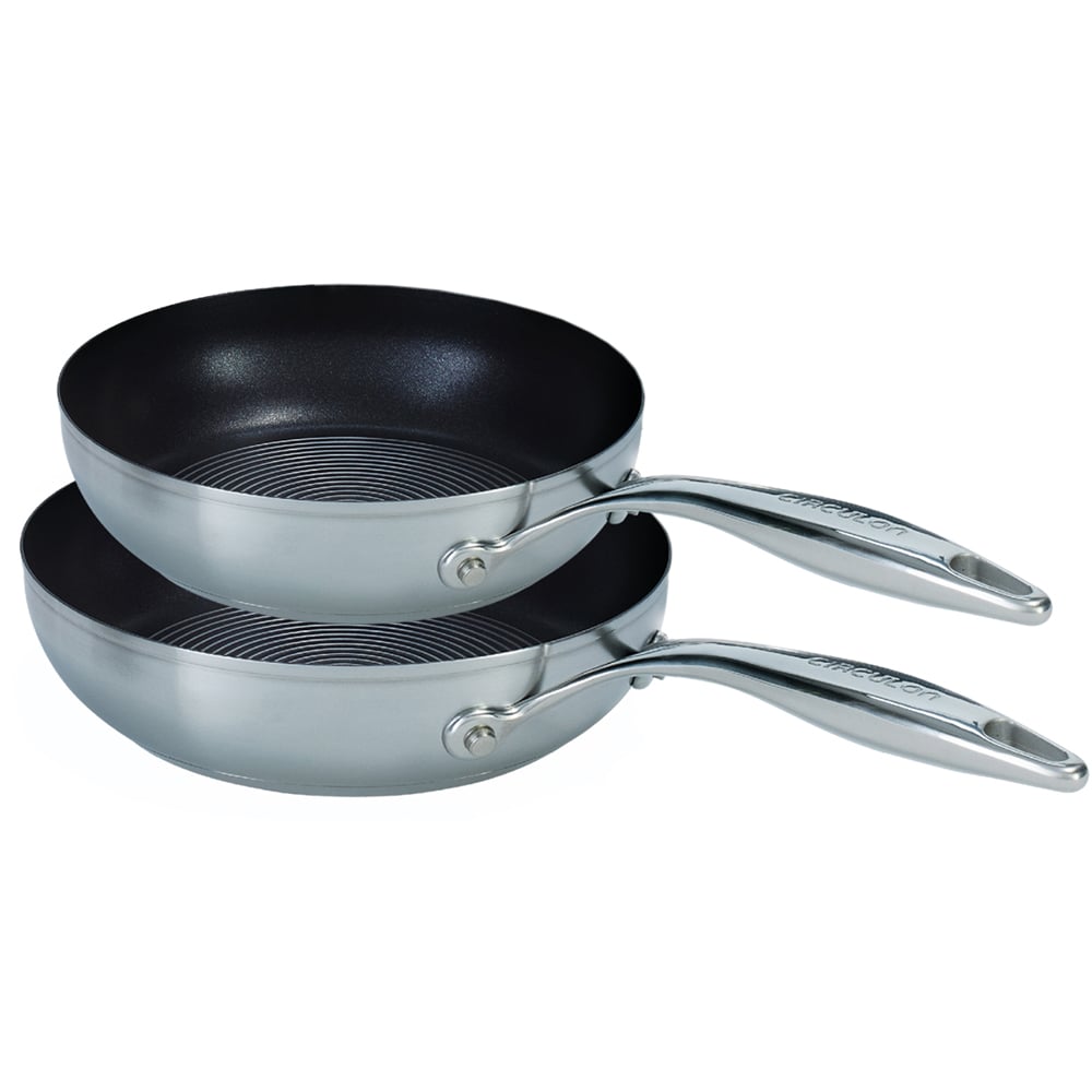 Experience the art of cooking with the Circulon Steel Shield S Series Nonstick Stainless Steel Frying Pan Set. Combining the beauty and durability of stainless steel with the ease and convenience of nonstick, this kitchen pan set is the best of both worlds. The cookware features steel peaks to protect the nonstick grooves, so you never have to worry about scratching nonstick again. With an extra thick base, the cookware heats up quickly to reduce hot spots on any cooktop, including induction. Featuring a stylish brushed stainless steel exterior, it is dishwasher safe for easy cleanup and oven-safe to 260°C for cooking a wide range of recipes. Plus, the nonstick is completely metal utensil safe. Set of two 20cm and 26cm frying pans.